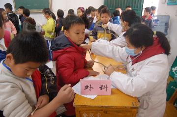 12月6日,全县实施城镇医疗保险参保人员免费健康体检“关爱行动”正式启动。连日来,我院组织医疗专家深入赣县城关小学、赣县城关三小等校园上门为孩子们进行免费体检。这是我院落实我县利民惠民政策,深入开展“精心谋事、用心干事、专心成事”教育实践活动、“三好一满意”活动的又一重要举措。此次行动,我院按照全县医疗保险健康体检关爱行动工作(实施)方案和体检安排等要求,抽调了大量医疗骨干,将利用短短12天的时间,对全县3944名在校参加城镇医疗保险的中小学生进行上门免费体检。学生体检的主要项目有一般检查、内科、外科、眼科、耳鼻咽喉科、口腔科、血常规、肝功能等。图为我院医务人员细心为县城关小学学生体检。