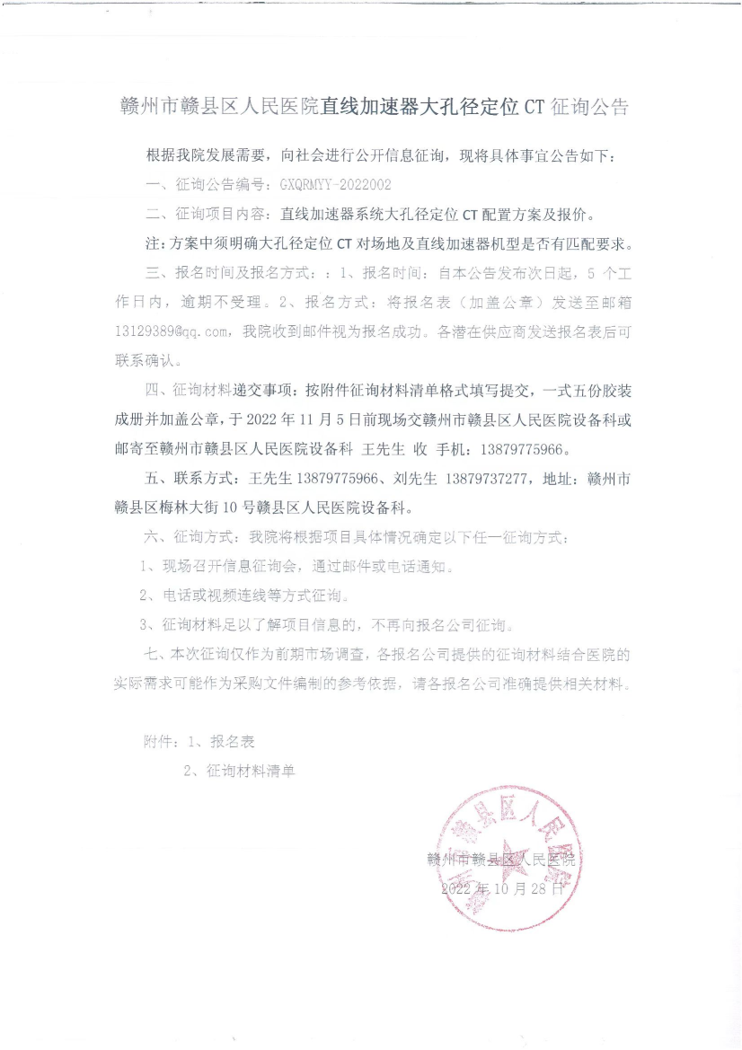 四、征询材料递交事项:按附件征询材料清单格式填写提交,一式五份胶装成册并加盖公章,于2022年11月5日前现场交赣州市赣县区人民医院设备科或邮寄至赣州市赣县区人民医院设备科 王先生 收 手机:13879775966。