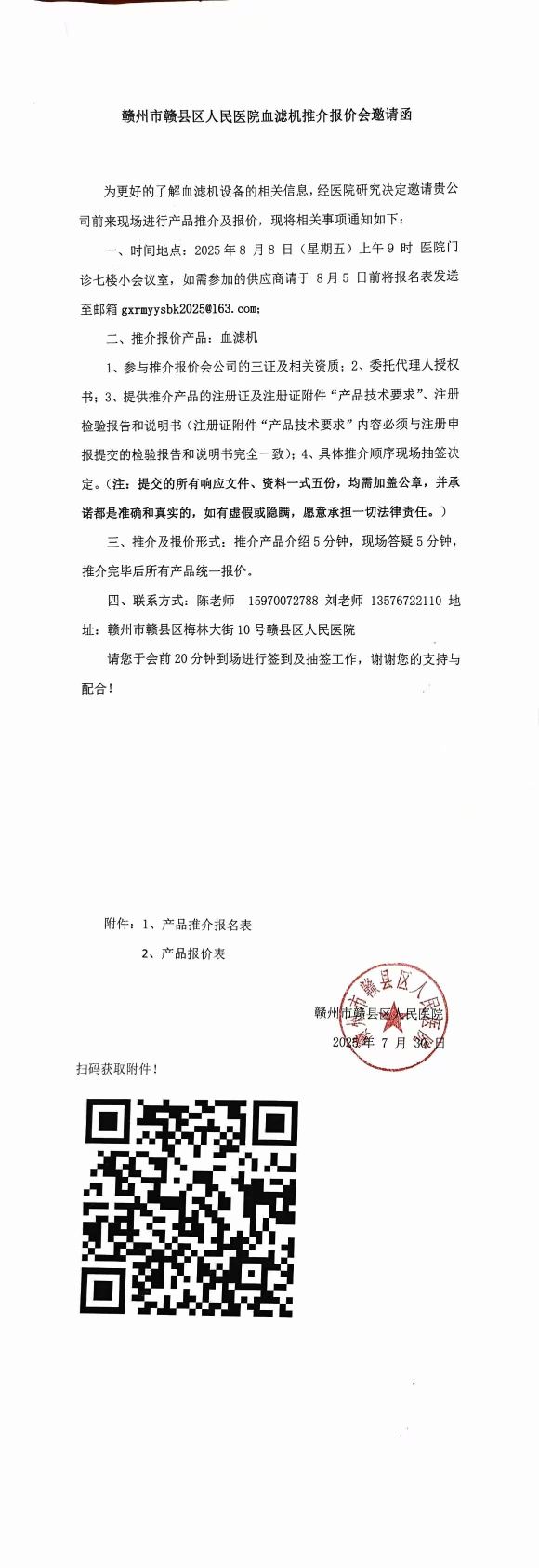 为更好的了解血滤机设备的相关信息,经医院研究决定邀请贵公司前来现场进行产品推介及报价,现将相关事项通知如下: